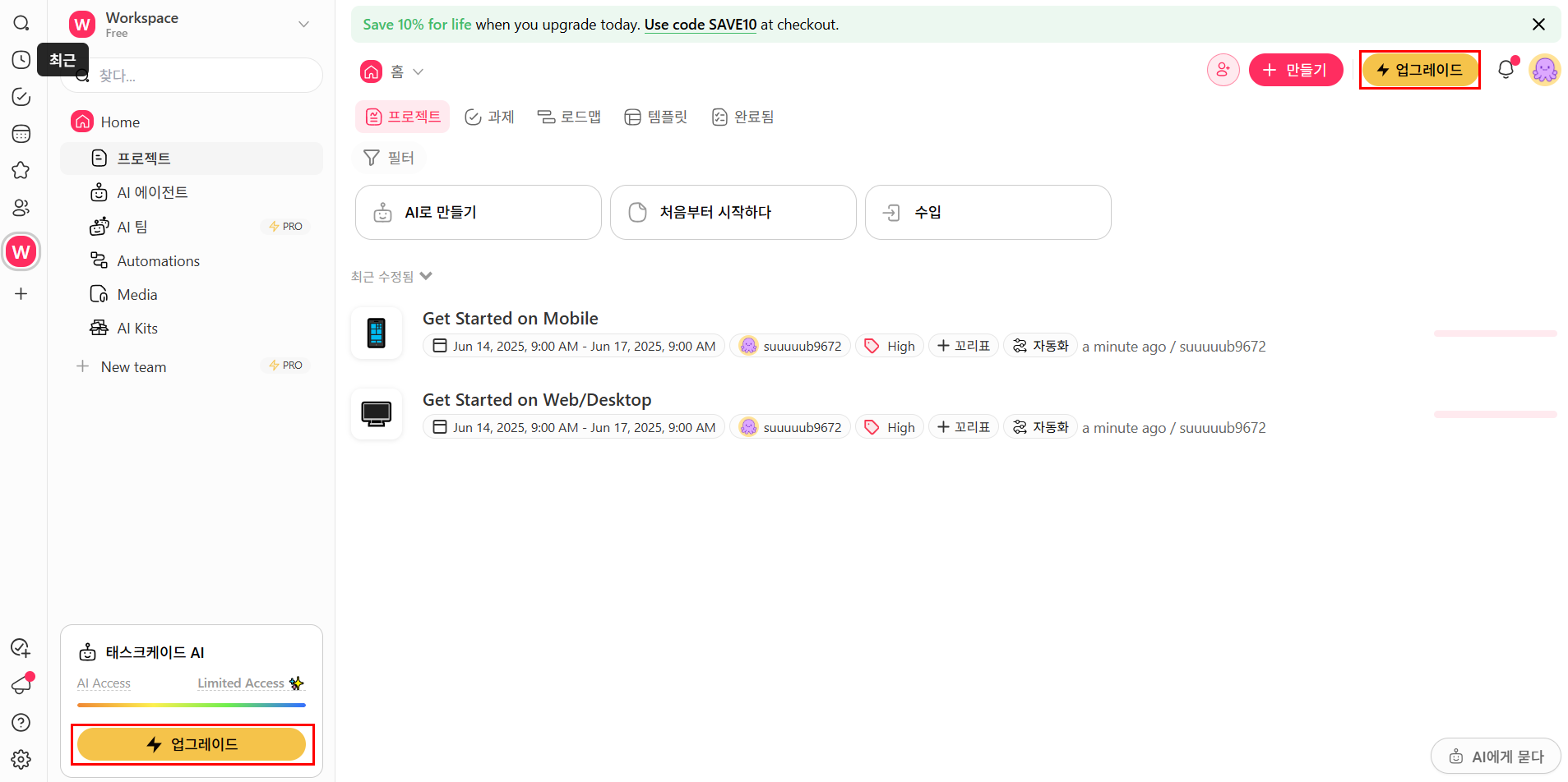 A. 개인 및 소규모 팀이라면 무료 플랜으로도 대부분의 기능(무제한 태스크, 프로젝트, 멤버, AI 요청 등)을 사용할 수 있습니다.